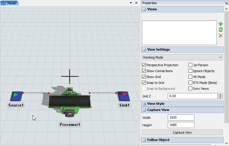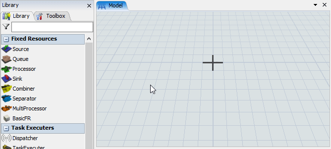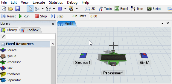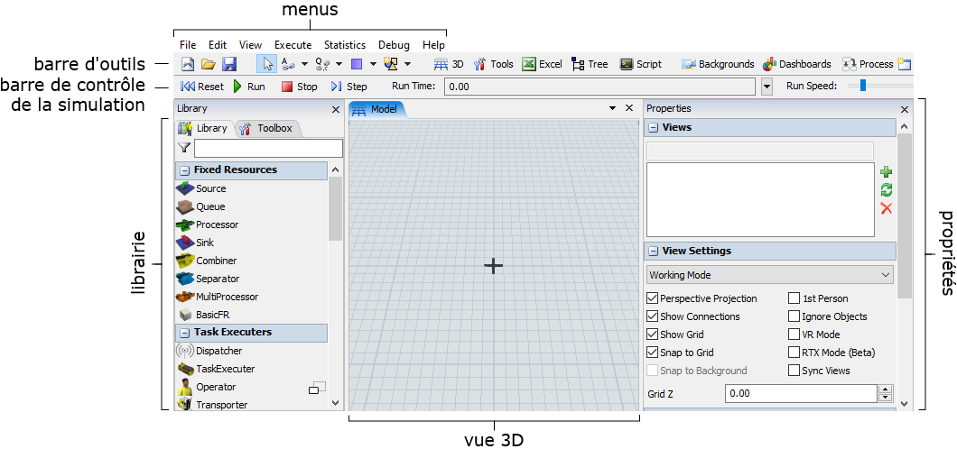 Voici les principaux éléments de l'interface FlexSim: