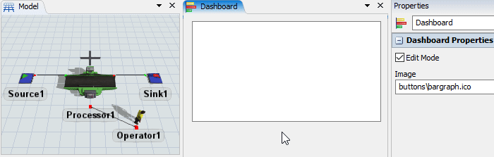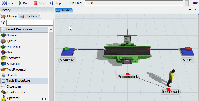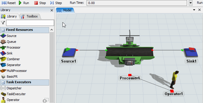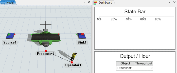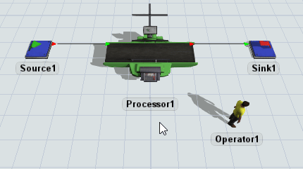 Dans ce modèle, un opérateur usine des pièces sur une machine et les transporte vers la sortie. À la fin du tutoriel, voici à quoi ressemblera votre simulation: