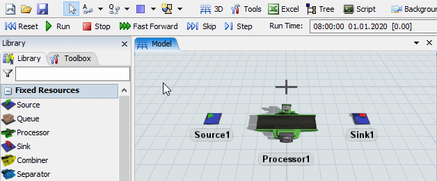 Dès le début de la simulation, un produit arrive sur la machine et son temps de process démarre. À la fin du temps de process, ce produit quitte la machine, et un nouveau produit arrive sur la machine. Et ainsi de suite.